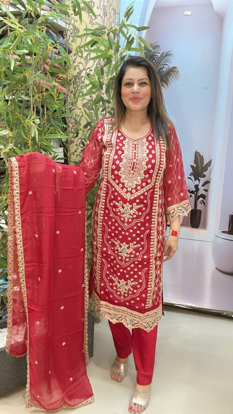 Step into elegance with this beautifully designed red suit set, perfect for festive and party wear.