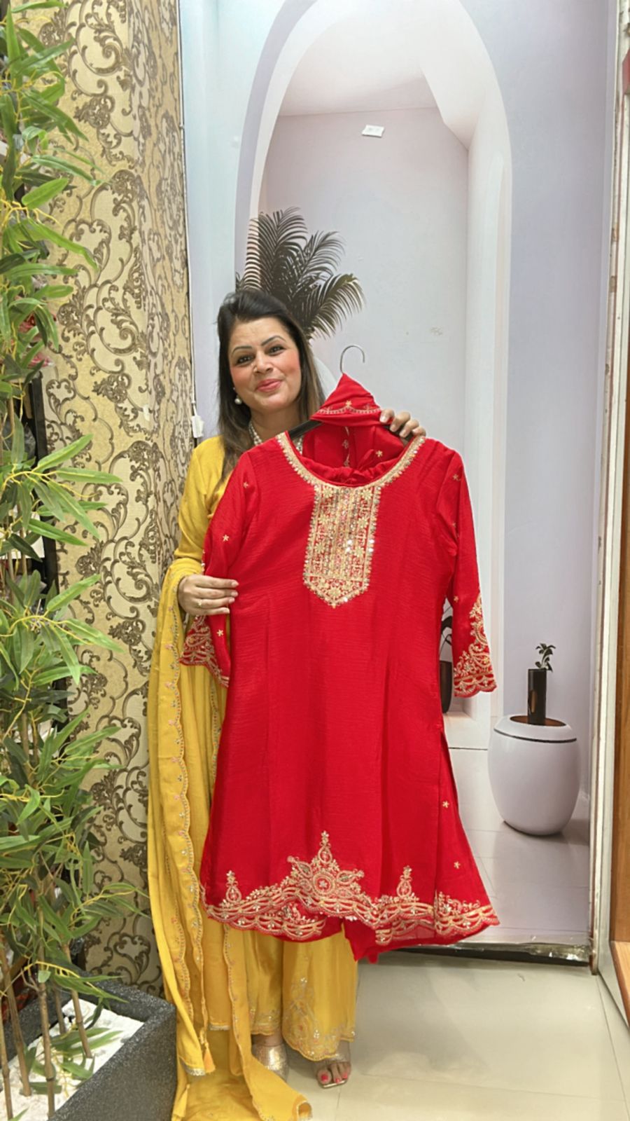 ❤️ Make a bold statement with this red embroidered suit, designed with delicate detailing and rich festive appeal.