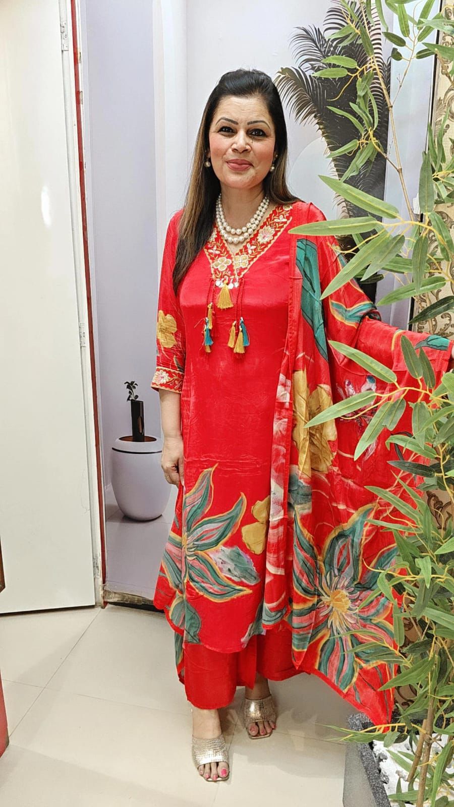 Brighten up your ethnic collection with this vibrant red floral printed suit, designed for comfort and effortless elegance.