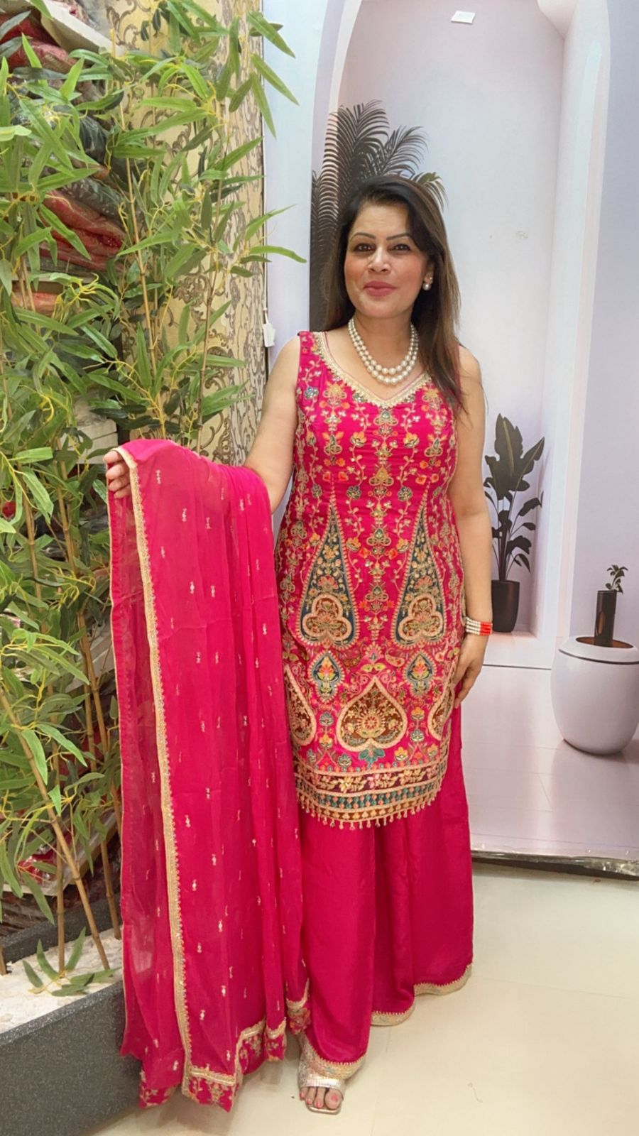 Turn heads with this elegant pink embroidered sharara suit, crafted to perfection for festive occasions and celebrations. The sleeve kurta is beautifully adorned with intricate multicolor thread embroidery and golden detailing, adding richness to the look. It is paired with a matching sharara bottom and a lightweight embroidered chiffon dupatta with a golden border, completing the traditional yet trendy ensemble.