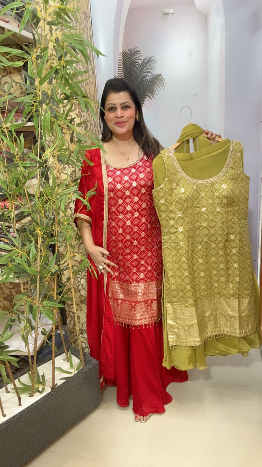 🌺 Banarasi Silk Suit Set with Dupatta – Red & Olive Green Variants 🌺