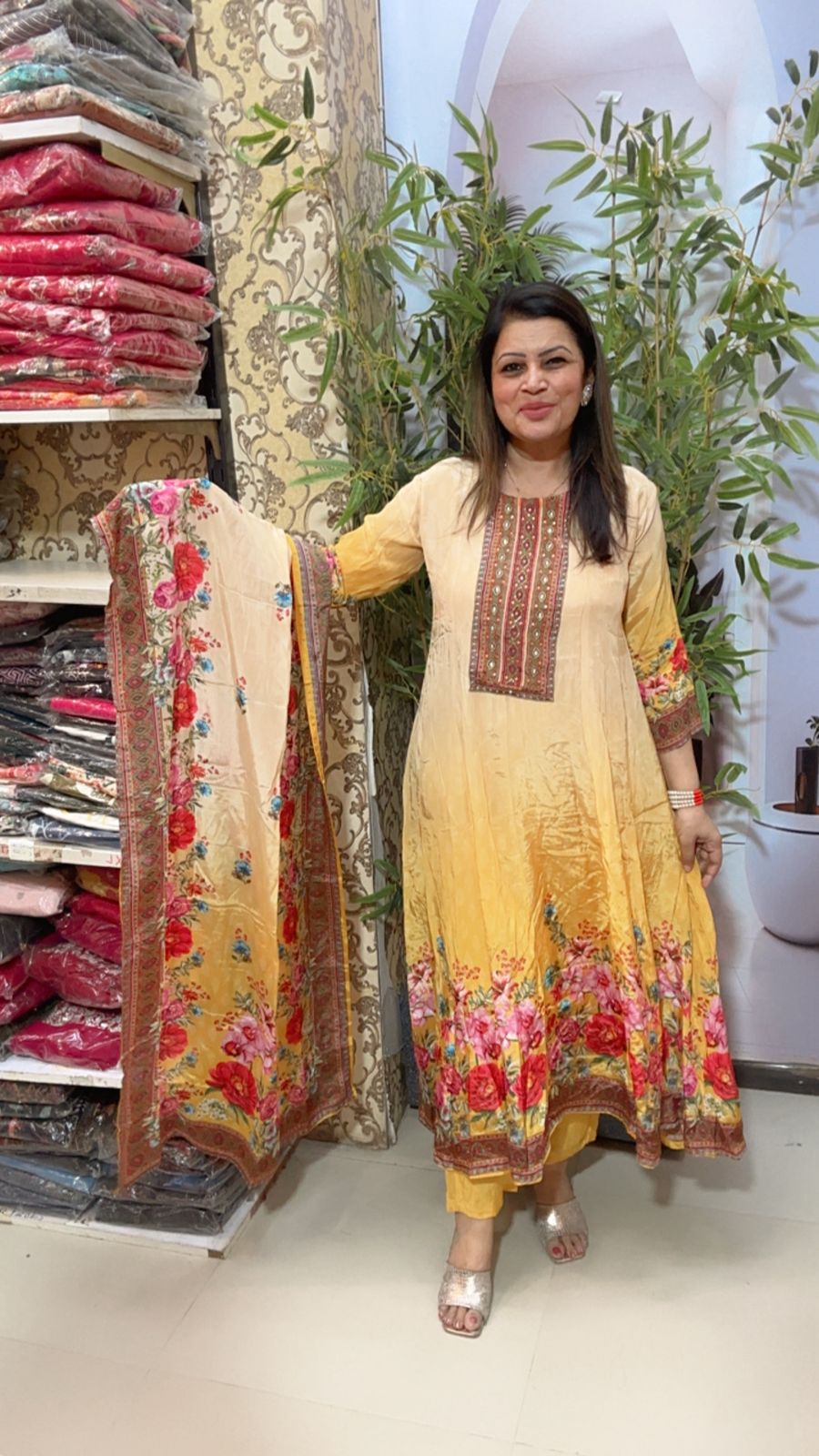 Add a splash of sunshine to your wardrobe with this stunning yellow floral printed suit set. Crafted from soft, comfortable fabric, this ethnic outfit beautifully blends tradition with modern elegance.