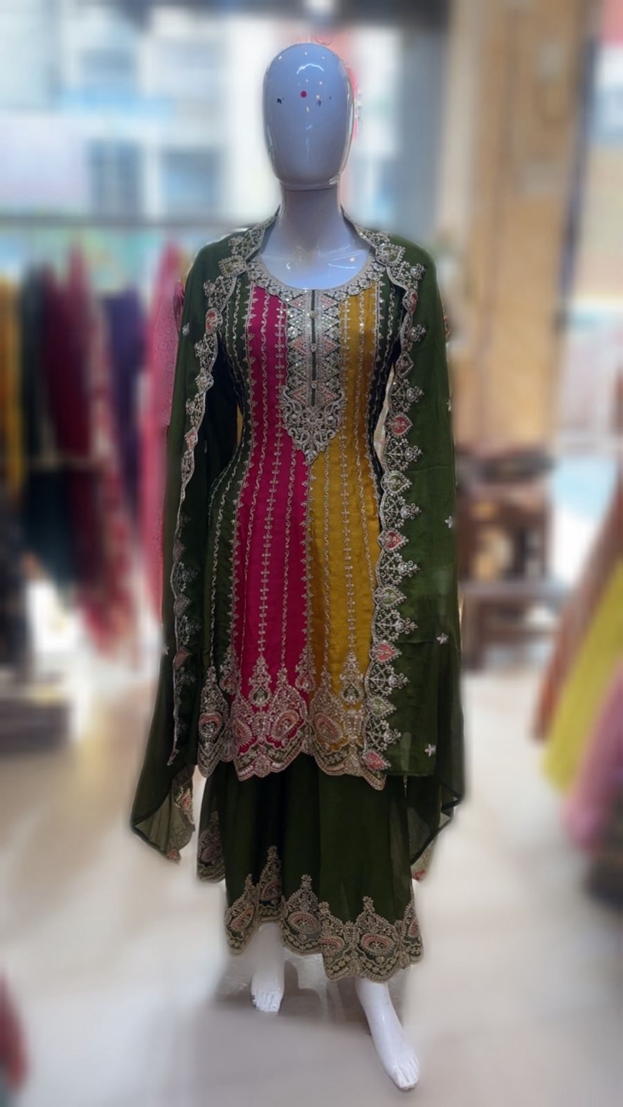 Step into timeless elegance with this beautifully crafted Pakistani suit. The outfit features a stunning combination of olive green, mustard yellow, and deep pink hues, perfectly balanced with intricate silver and zari embroidery. The front panelled design enhances your silhouette, while the delicate lace detailing on the borders adds a touch of sophistication.