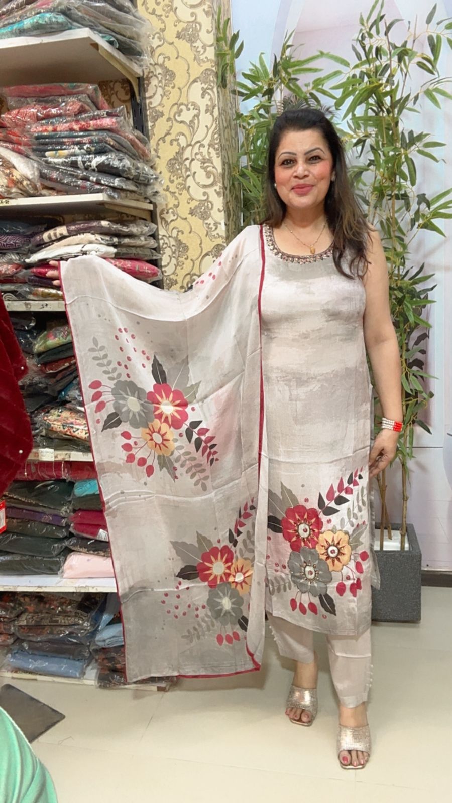 Add a touch of sophistication to your wardrobe with this graceful grey floral suit set. Designed with subtle elegance, the outfit features a soothing grey base adorned with vibrant floral prints in shades of red, pink, and yellow, creating a perfect blend of simplicity and charm.