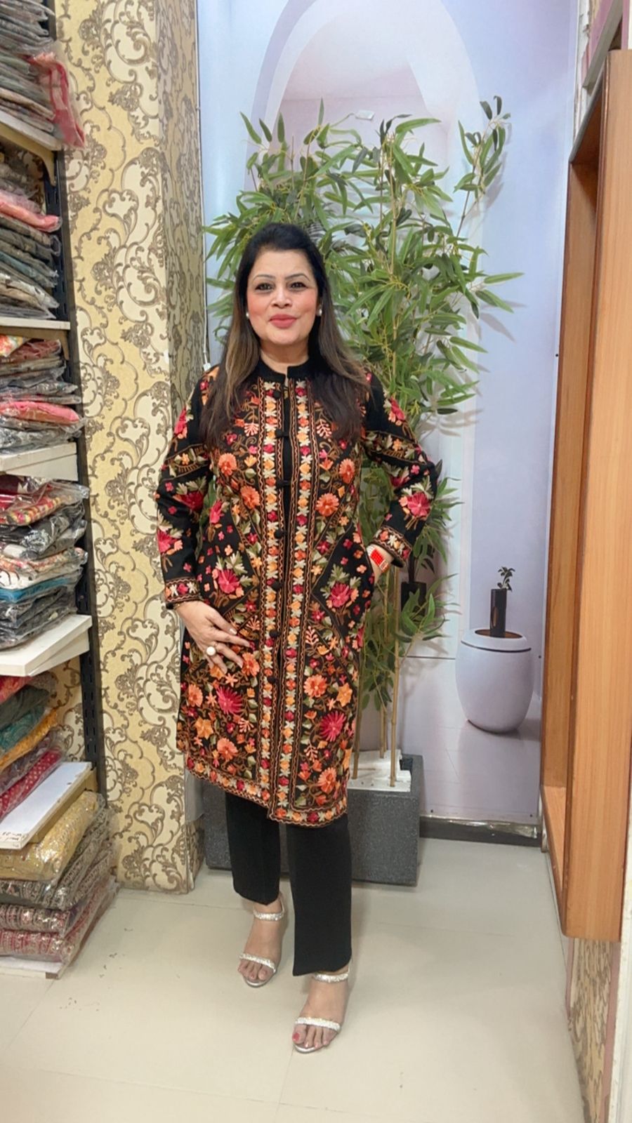 Make a stunning statement with this beautifully crafted long kurti, featuring intricate multi-color embroidery inspired by traditional Kashmiri craftsmanship. The rich floral detailing stands out perfectly against the classic black base, giving it a luxurious and timeless look.