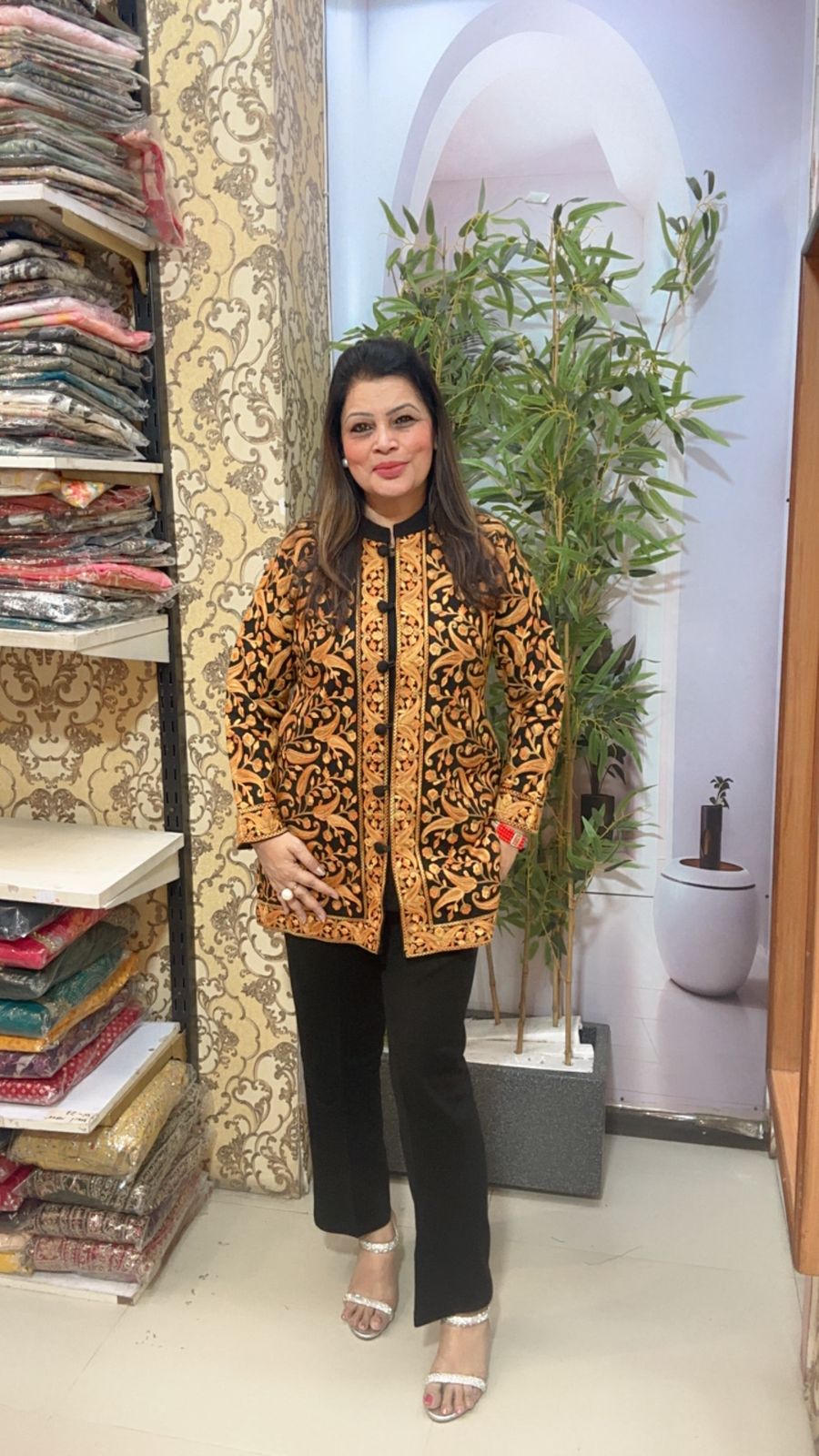Elevate your wardrobe with this stunning Kashmiri-style embroidered jacket, a perfect blend of tradition and modern elegance. Crafted on a rich black base, the jacket features intricate mustard-colored Aari embroidery that creates a bold and regal look.