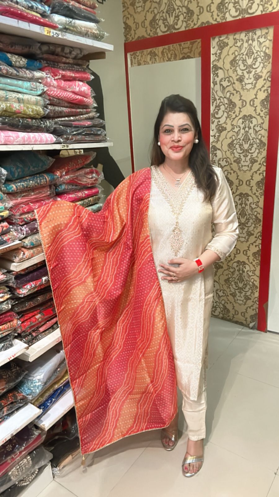 🧵 Fabric: Silk blend with Bandhani print dupatta 🎨 Color: Cream suit with red-orange dupatta