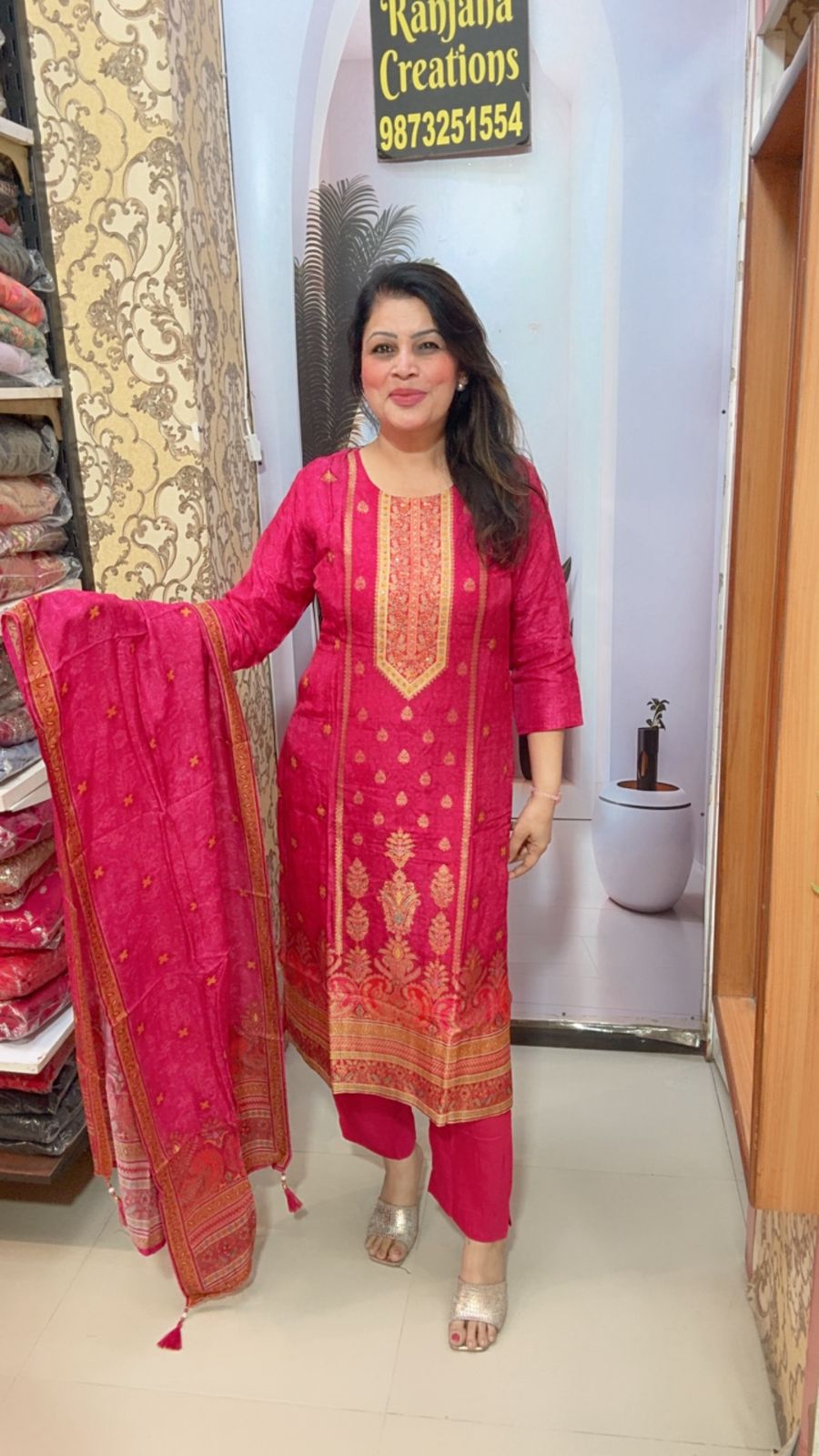 Command attention at any celebration in this stunning, vibrant Pink Salwar Suit. Crafted from a luxurious fabric (appears to be a silk blend or brocade), this three-piece set is perfect for festive occasions, weddings, and formal events.