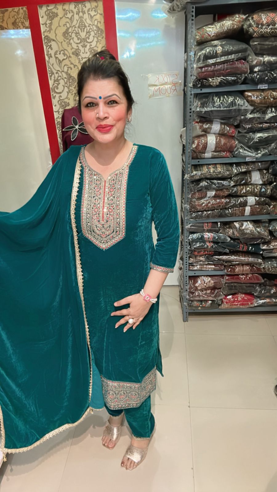 Elevate your festive and occasion wear collection with this Teal Green Velvet Embroidered Suit Set. Crafted from luxurious velvet fabric, this elegant ensemble features intricate zari and thread embroidery along the neckline, sleeves, and hemline — adding a regal touch to your look.