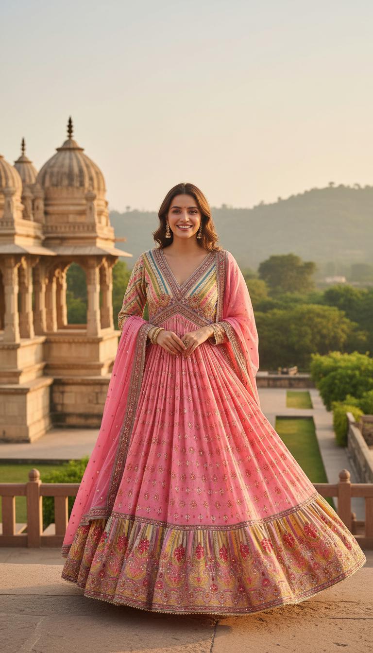 Description: Step into an era of timeless elegance with our Jaipur Blush Anarkali. Inspired by the architectural majesty of Rajasthan, this floor-length masterpiece is designed for the modern woman who cherishes traditional roots.