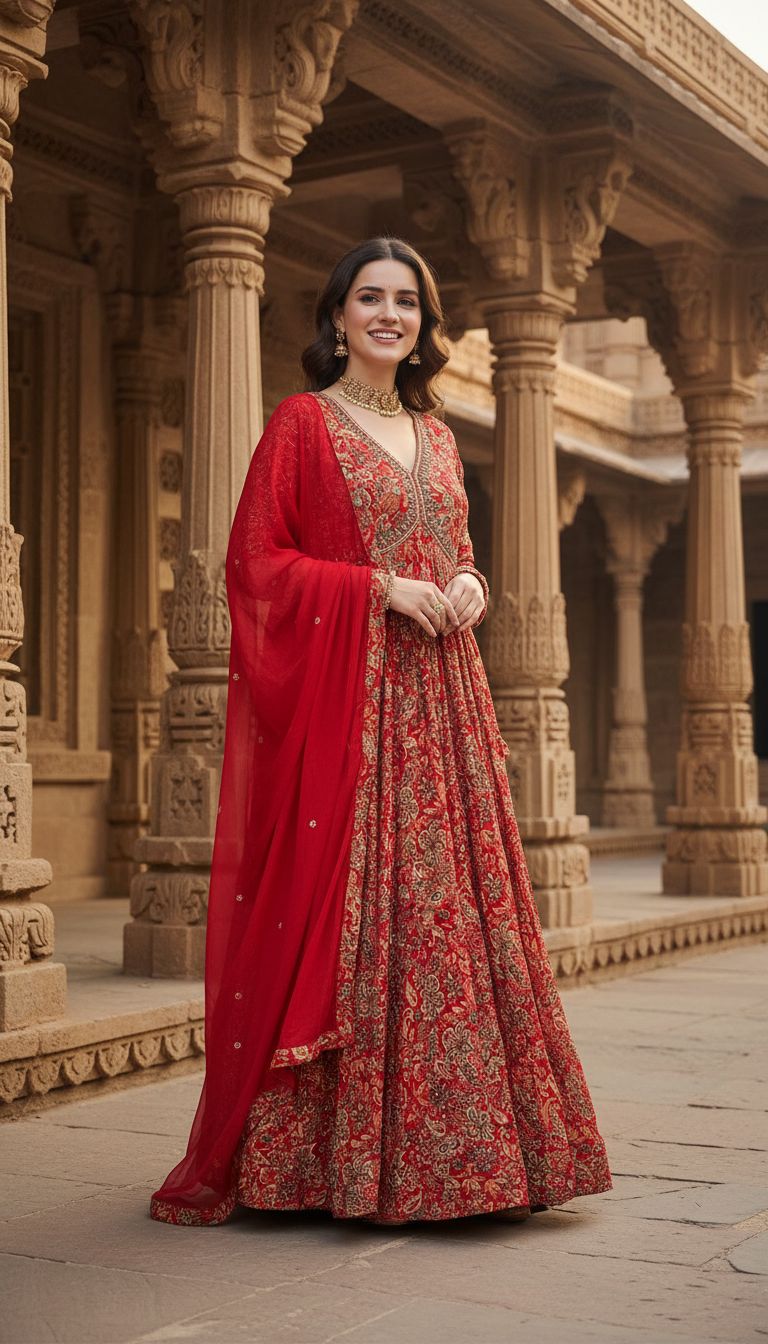 Description: Strike the perfect balance between traditional charm and modern comfort with this Wine & Gold Anarkali. The sleeveless silhouette allows for freedom of movement, making it ideal for dancing. The bodice features vibrant floral embroidery, while the skirt showcases a classic dotted Bandhani-style print. It is paired with a contrasting golden net dupatta that adds a festive glow to the look.
