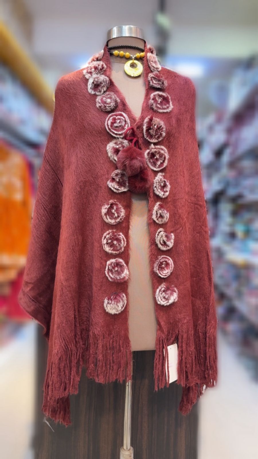 Elevate your winter style with this elegant wool blend PONCHOÂ featuring beautifully crafted floral fur embellishments along the front border. The soft maroon hue adds warmth and grace, while the furry pom-pom tie-up enhances its cozy charm. Designed for both comfort and luxury, this shawl is perfect for casual outings, festive gatherings, and evening wear.
