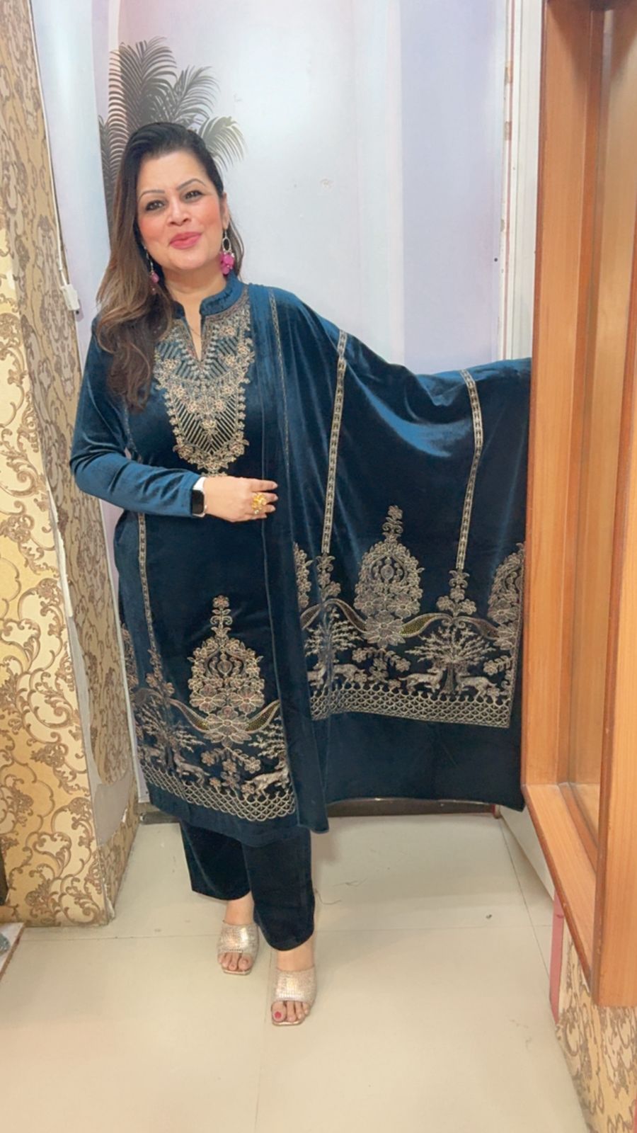 ✨ Royal Velvet Ensemble: Teal Blue Embroidered Suit with Shawl