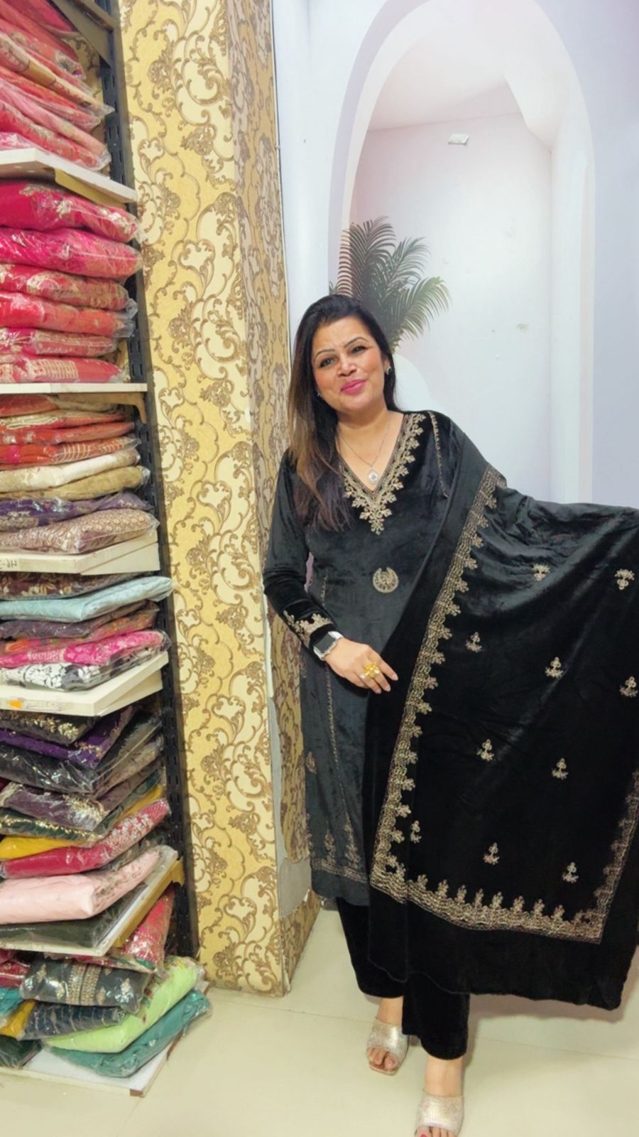 The long-sleeve kurta features delicate gold-toned zari embroidery on the V-neckline and cuffs, providing just the right amount of sparkle. The ensemble is completed with a rich, oversized velvet shawl/dupatta, intricately embroidered along the borders to elevate the entire look. Whether attending a formal dinner, a wedding reception, or a holiday party, this classic suit guarantees effortless glamour.