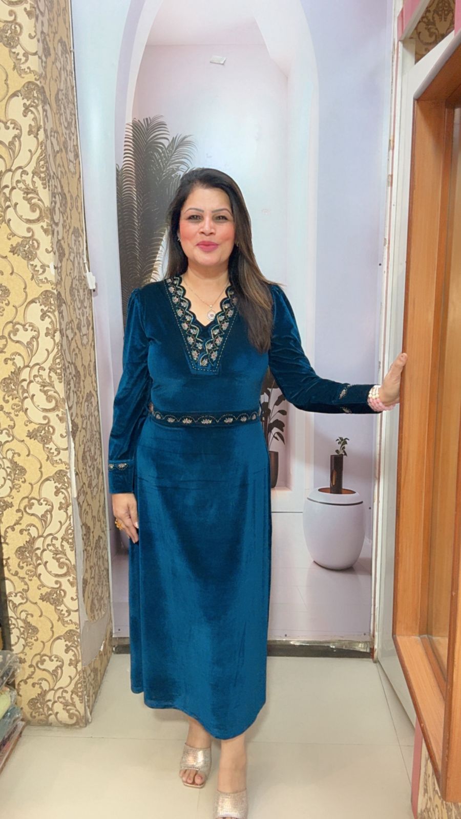Command attention in this breathtaking velvet midi dress, rendered in a mesmerizing, deep Teal/Peacock Blue hue. The luxurious, soft velvet fabric drapes beautifully, offering superior comfort and warmth.